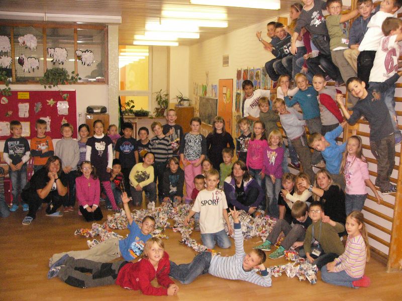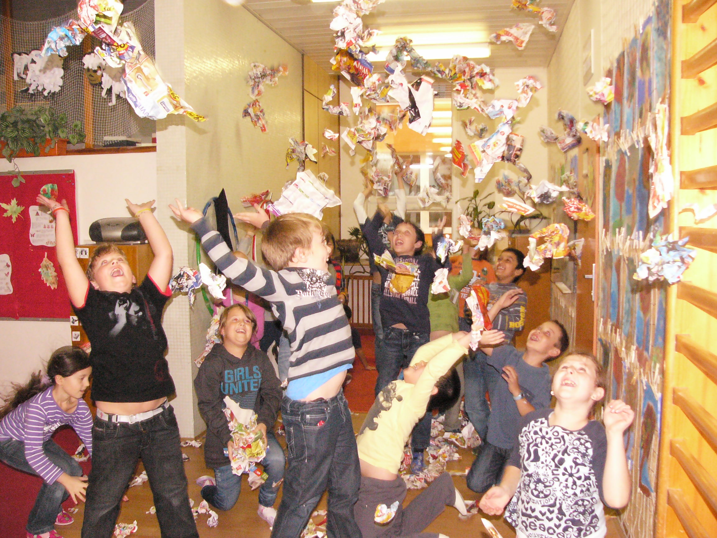 K čemu mohou děti použít novinový papír? Třeba k výrobě maxi zvířátek. To chce spoustu rukou, lepidlo, noviny, mnoho lepící pásky, fantazii a trpělivost. Děti ze tří družinek se zapojily do této soutěže o nejhezčí zvířátko. Děti mačkaly jednotlivé kousky novin do tří hromádek. Děti v jednotlivých skupinkách spojily všechny své síly, a protože výborně spolupracovaly, vytvořily překrásné výrobky - hada, želvu a mládě hada. Zbylé zmačkané papíry jsme všichni společně vyhodilii nad sebe, aby nám sněžil novinový sníh. Byla to nádhera.