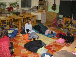 V pátek 21. 10. navečer bylo možno zahlédnout ve vestibulu naší školy skupinu druháků s baťůžky, spacáky a karimatkami. Na všech bylo patrné očekávání následujících dobrodružství. A děcka se hned záhy mohla přesvědčit, že společné chvíle budou zajímavé. Skřítek Novolíšňák jim totiž zanechal psaní, že jim schoval dobroty ke společné večeři. Byl ale férový, označil cestu k jejich pátrání, ale zdůraznil pravidlo, že děcka musí být parta a hledat společně.