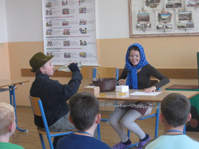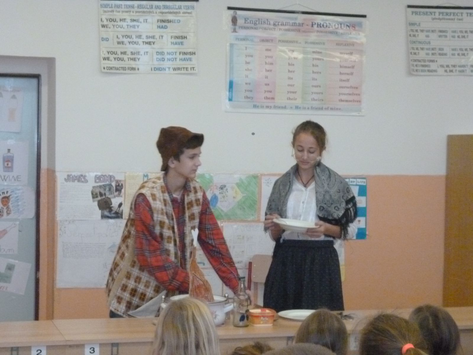 Nastudování pohádky v anglickém jazyce pro mladší kamarády se tentokrát ujali žáci tříd 7.A a 7.B. Naučili se anglickou verzi pohádky Stone Soup (Kamenná polévka), u které museli mj. zvládnout poměrně širokou slovní zásobu z oblasti kuchyně a vaření. Repríz představení bylo tentokrát hodně - pro žáky věech 3. tříd a většnu žáků 4. a 5.tříd.