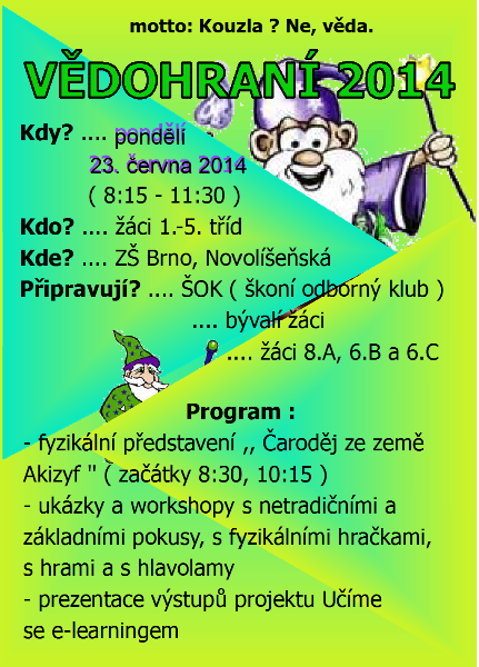V pondělí 23.června 2014 proběhla již popáté akce Vědohraní. Zúčastnilo se jí téměř 550 dětí z I.stupně. Program připravovalo 90 organizátorů ze II.stupně (žáci 8.A, 6.B,C) a bývalí žáci ZŠ. Všichni účastnící Vědohraní shlédli fyzikální představení „Čaroděj ze země AKIZYF“. Diváci navštívili jedno dopolední vyučování v netradiční čarodějnické škole kouzel, např. hodinu levitace a kouzlení, hodinu zmenšování a zvětšování, hodinu akrobacie nebo hodinu krasohledění,…
