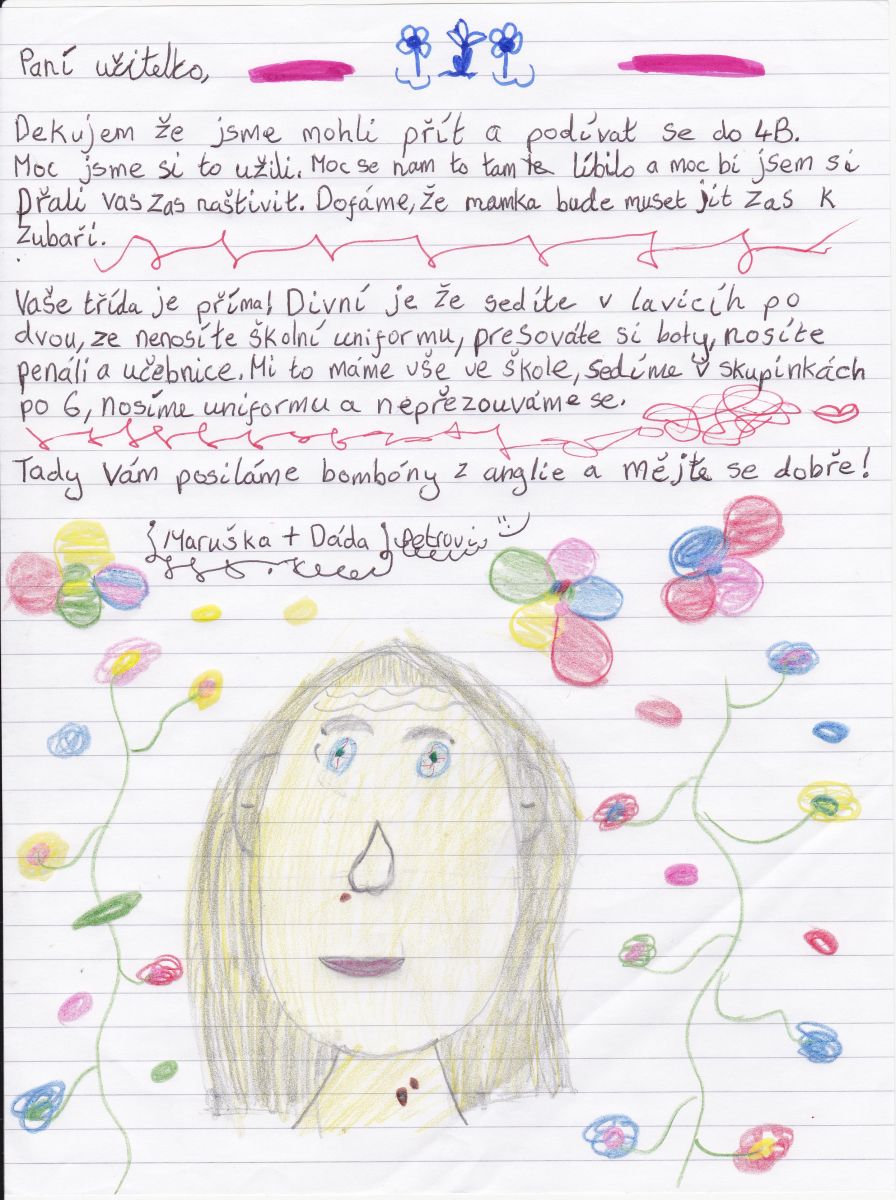 Žáci třídy IV.B měli ve vyučování zajímavou návštěvu - děti žijící dlouhodobě v Anglii, kterým ale dosud zůstala (byť nedokonalá) znalost češtiny. Můžete si přečíst jejich milý dopis.