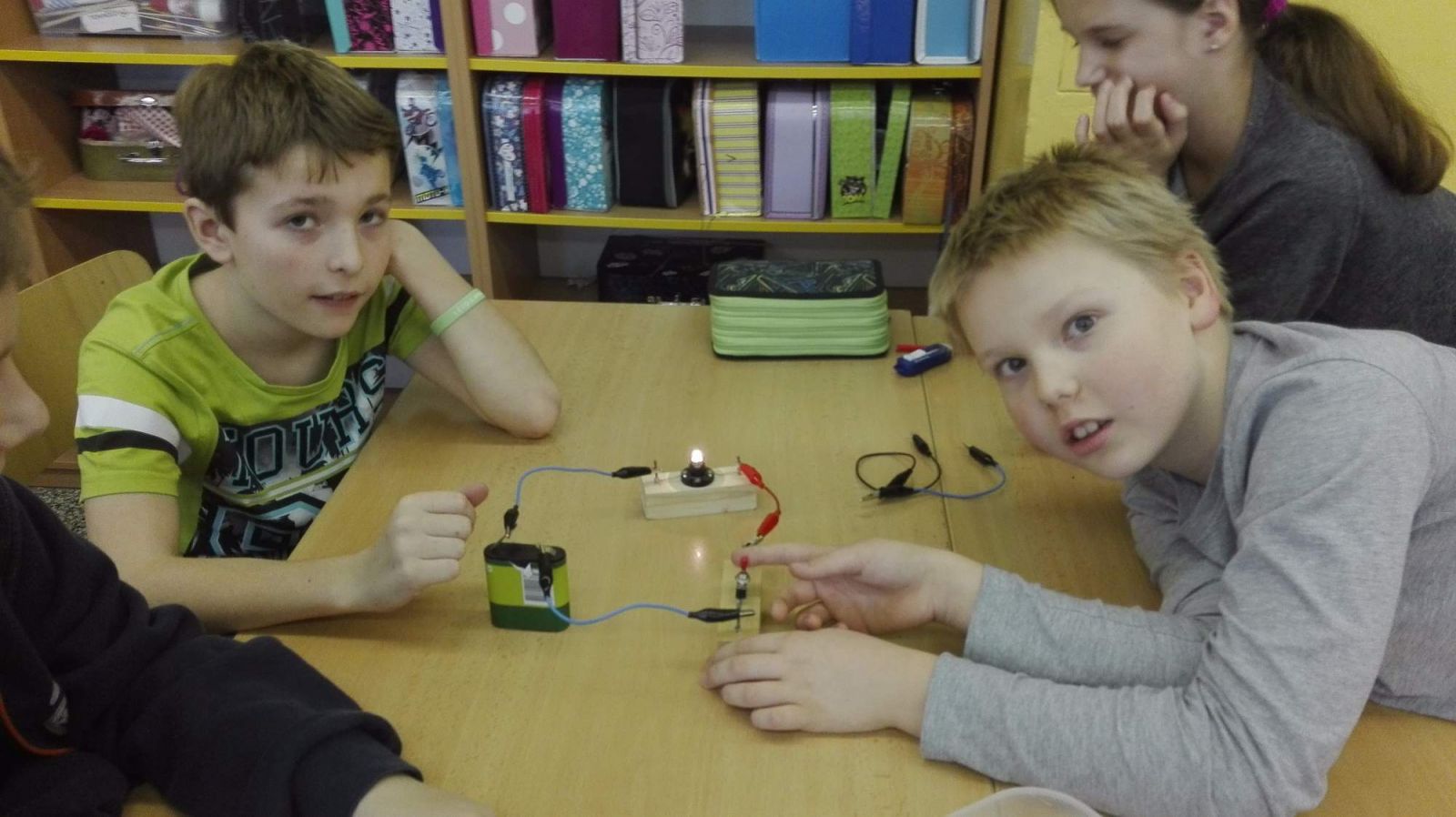 Začátkem prosince pro nás paní učitelka Pejčochová z druhého stupně připravila krásný výukový program na téma Elektřina. Dozvěděli jsme se spoustu nových věcí. Například, že elektřina vzniká třením nebo že protiklady se přitahují a naopak látky se stejným nábojem se odpuzují. Nejvíce nás bavili pokusy. Zjistili jsme, že obyčejné brčko dokáže držet na ledasčem. Také jsme zapojovali elektrické obvody a sestavovali co nejdelší dráhu tak, aby se rozsvítila žárovka.