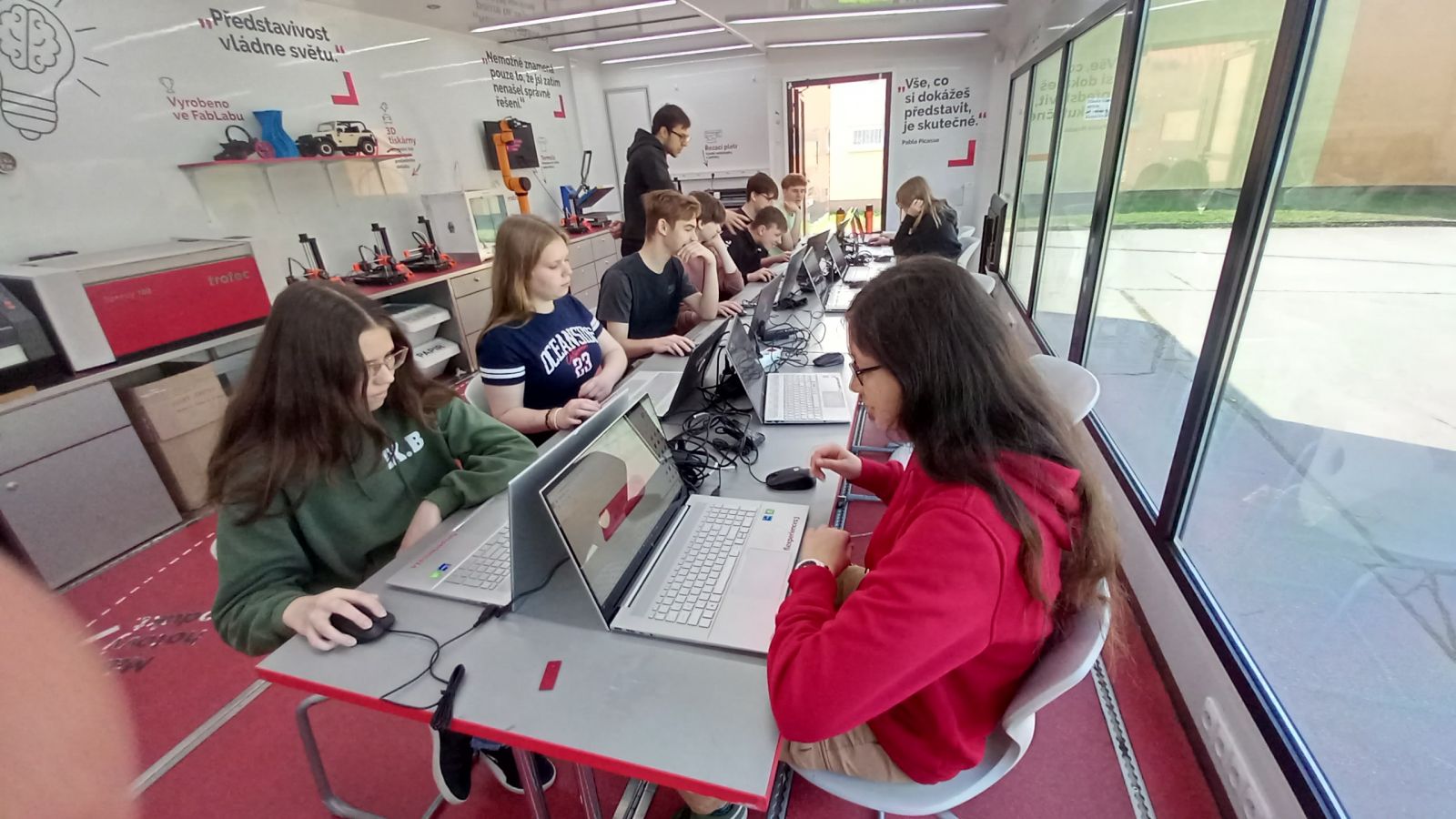 Již podruhé měli žáci naší školy možnost navštívit první otevřenou digitální dílnu v Brně FabLab. Konkrétně ve dnech 2. – 13. 5. zaparkoval u naší školy kamion plný moderních výrobních strojů jako je 3D tiskárna, termolis, řezací plotr, laserová řezačka nebo modelovací frézka.