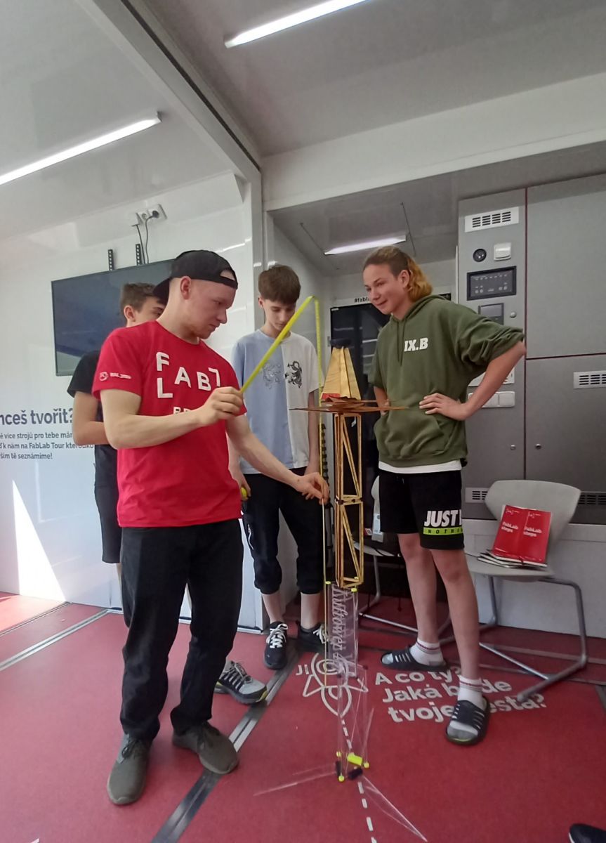 Vrcholem bylo soutěžní klání mezi třemi týmy z 9. ročníku, které po podrobnějším zaškolení věnovali šest hodin návrhu a zhotovení objektu vyhovujícímu co nejvíce zadání. Tím byla co nejvyšší věž, na jejímž vrcholku se udrží tenisový míček. K dispozici měli dvě desky z překližky a plexiskla o rozměrech 60 cm x 30 cm a výše zmíněné vybavení FabLabu. Vítěznému týmu z 9. B ve složení Matěj Josefi, Petr Šujan, Šimon Vosátka a Jakub Škranc se podařilo vytvořit věž o úctyhodné výšce 132 cm. Jak vítězný tým tak všichni ostatní soutěžící obdrželi věcné ceny.