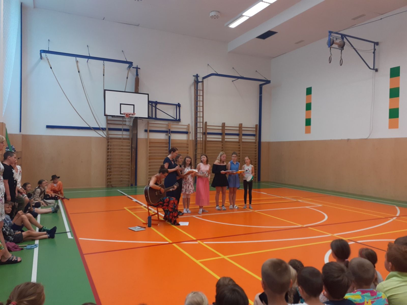 Ve čtvrtek 16.6. se v tělocvičně školy konala besídka pro děti z 1. stupně. Nejprve zahrála divadlo třída 4.B. Vybrali si pověst o Ctiradovi a Šárce a u diváků měli velký úspěch. Jako druhé vystoupily dívky z anglického sboru a zazpívaly několik lidových anglických písní, které tento rok v kroužku nacvičili. Poslední vystoupení bylo taneční. Dvě skupiny složené z žáků a žákyň naší školy předvedlo taneční show s promyšlenou choreografií a zajímavými prvky. Těšíme se na další podobné akce!