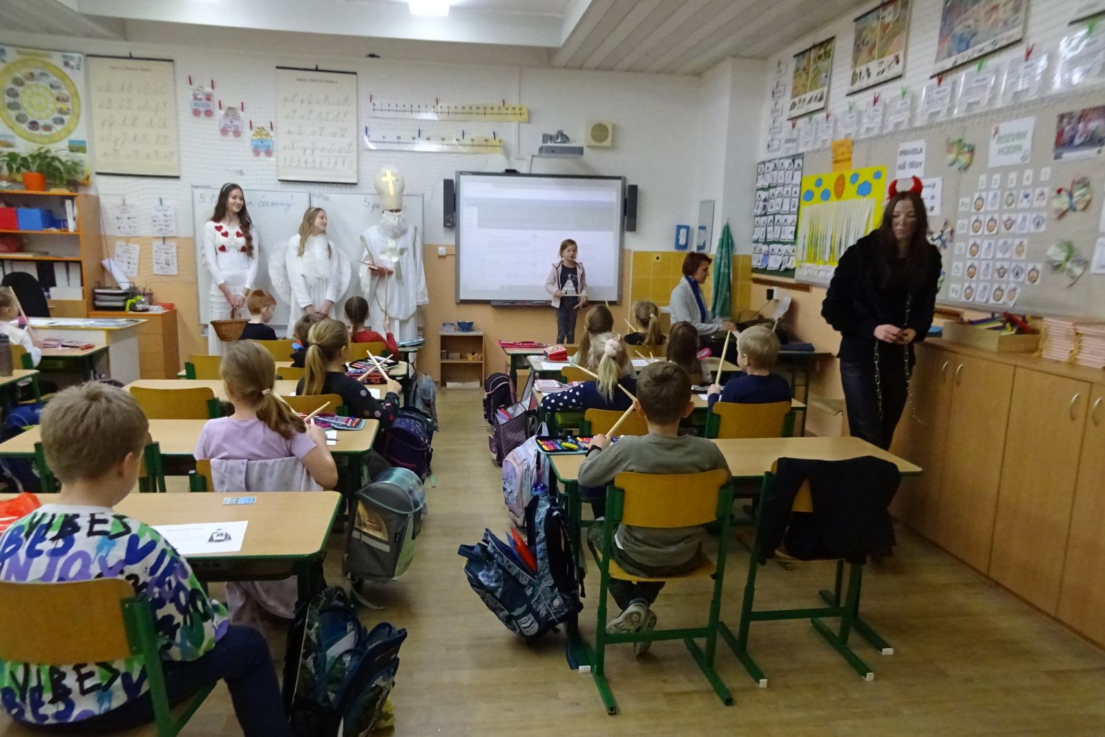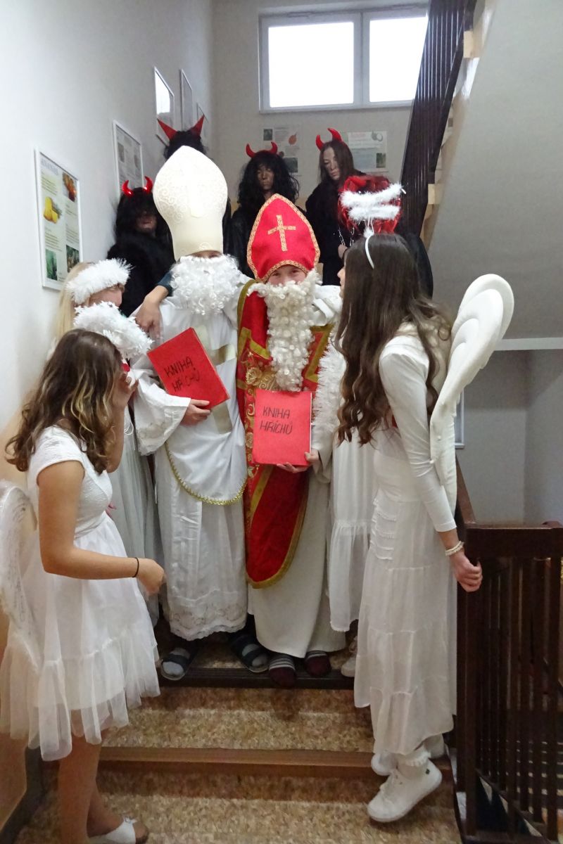 V pondělí 5. 12. naši školu navštívily dvě družiny Mikulášů, Andělů a Čertů. Děti na 1. stupni si pro ně nachystaly říkanky a písničky, a protože většina dětí neměla v Knize hříchů žádný záznam, tak byly obdarovány sladkými dobrotami. Děti, které nějaký ten malý záznam měly, tak slíbily, že se v příštím roce budou více snažit a nebudou zlobit. Mikulášská nadílka se všem moc líbila a opět se na ni za rok těšíme.