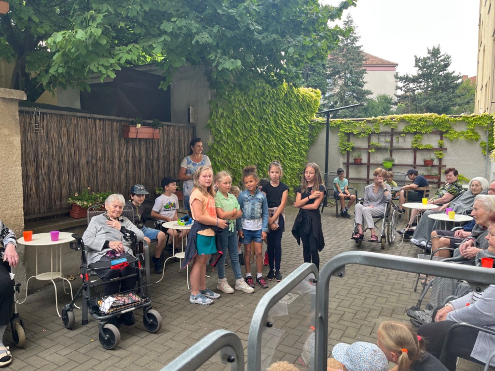 V posledním červnovém týdnu, tři dny před vysvědčením, jsme ještě stihli navštívit náš spřátelený Domov pro seniory v Židenicích. Byli jsme mile překvapeni, jaký zajímavý program si tentokrát oni přichystali pro nás. Mohli jsme si vyzkoušet řadu aktivit, které nám připadají banální, ale ve stáří se mohou stát velkým problémem. Třeba navlékání korálů se zhoršenou jemnou motorikou, skládání puzzle s poruchou zraku, nedoslýchání slov, pohyb na vozíku, nebo potíže s pamětí. Abychom nepřicházeli zcela s prázdnou, zazpívali jsme babičkám a dědečkům pár veselých písniček plných letní atmosféry a předali jim drobné papírové dárečky – naše vlastní výrobky.