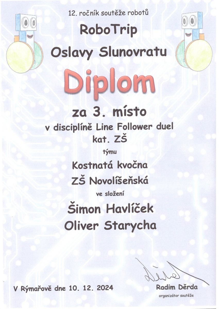 Členové našeho kroužku LegoRobotiky dosáhli dalšího úspěchu v soutěži robotů. Tentokrát se jednalo o celostátní soutěž Robotrip, která se konala 10. 12. 2024 v Rýmařově.Tým našich žáků Šimon Havlíček a Oliver Starycha (9.A) s přispěním Marie Vargové (9.C) vybojoval 3. místo v disciplíně Line Follower duel, ke kterému jim srdečně blahopřejeme.